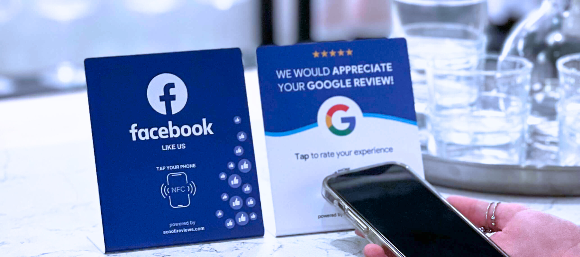 A simple tap from your customers' smartphones opens your Google Reviews & Social Media pages instantly.